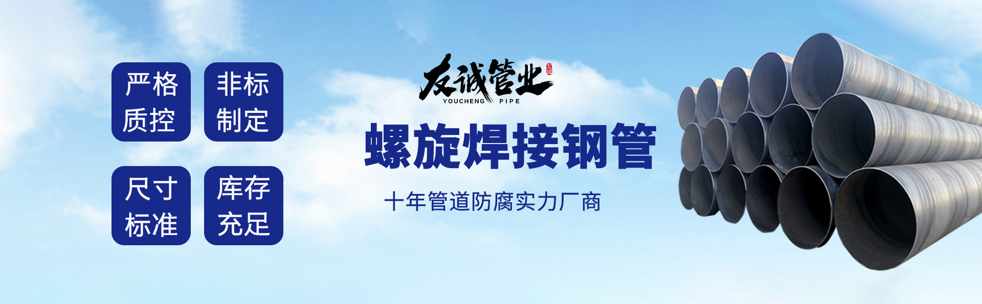 滄州友誠管業(yè)有限公司是一家專業(yè)從事生產(chǎn)防腐涂塑管道及管件于一體的大型企業(yè)。公司注冊資金8600萬元,位于中國管道生產(chǎn)基地—河北鹽山縣,近靠京滬高速、榮烏高速、黃石高速30公里,高鐵滄州西站40公里,天津國際機場、濟(jì)南遙墻機場150公里,為客戶來訪及業(yè)務(wù)發(fā)展提供了便利的交通條件。 鋼管系列:螺旋鋼管、無縫鋼管、ERW直縫焊管、JCOE埋弧焊直縫鋼管、熱鍍鋅鋼管。 涂塑系列:內(nèi)外涂塑鋼管、涂塑復(fù)合鋼…… 了解更多
